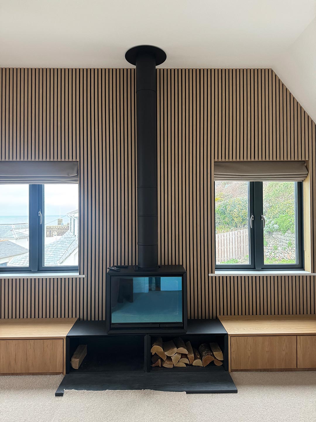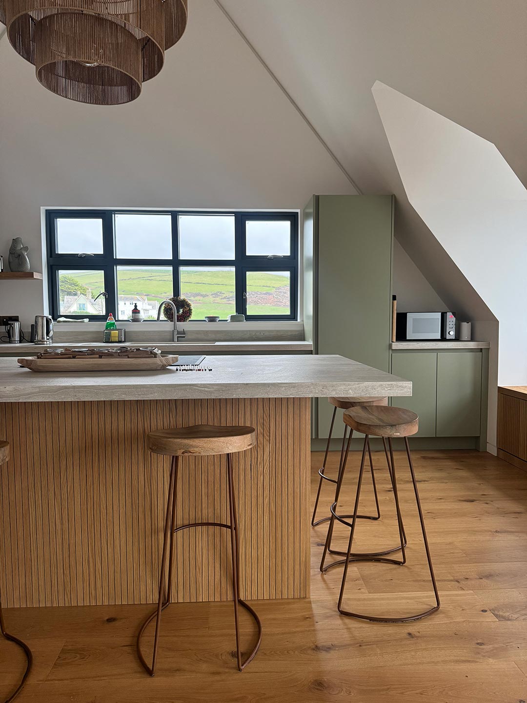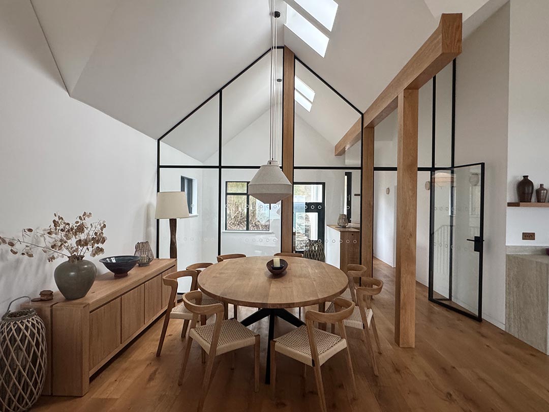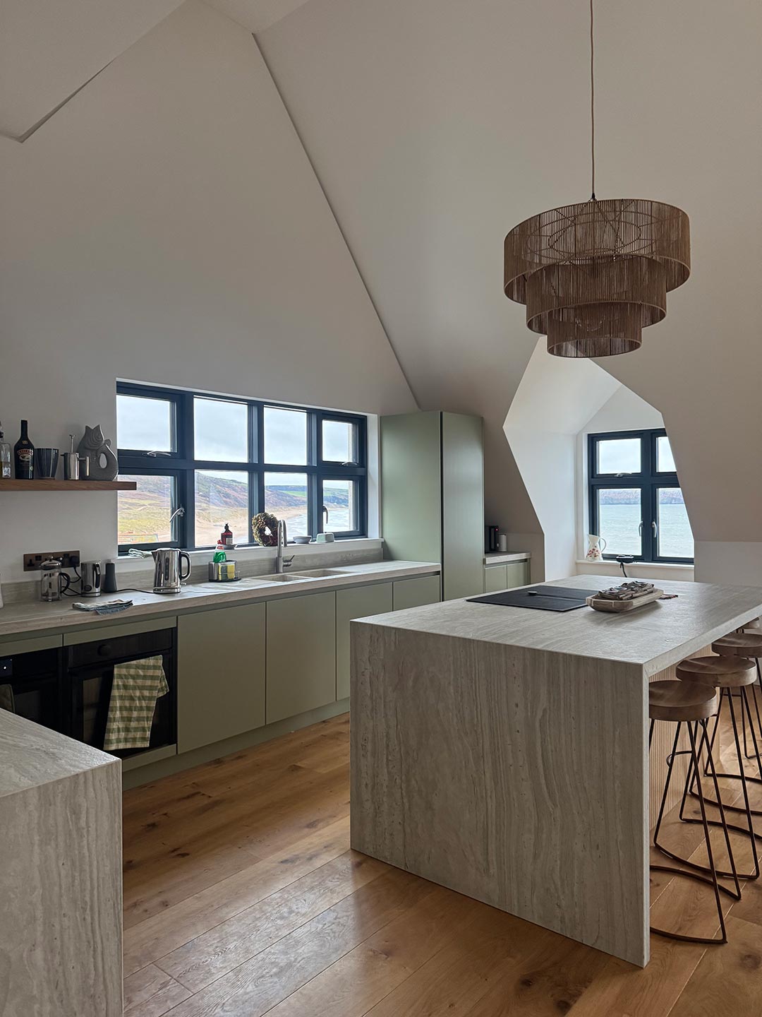 Esta casa, diseñada por Woodward Smith Architects, cuenta con impresionantes vistas de la playa de Woolacombe. La cocina y la sala de estar se diseñaron estratégicamente en torno a estas vistas para permitir a los clientes apreciar el impresionante paisaje en cada oportunidad. Los grandes ventanales sirven de punto focal en ambos espacios, ofreciendo una conexión perfecta entre el interior y el exterior.