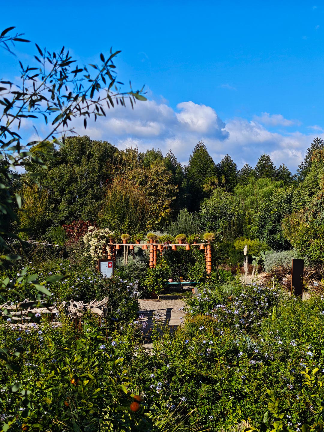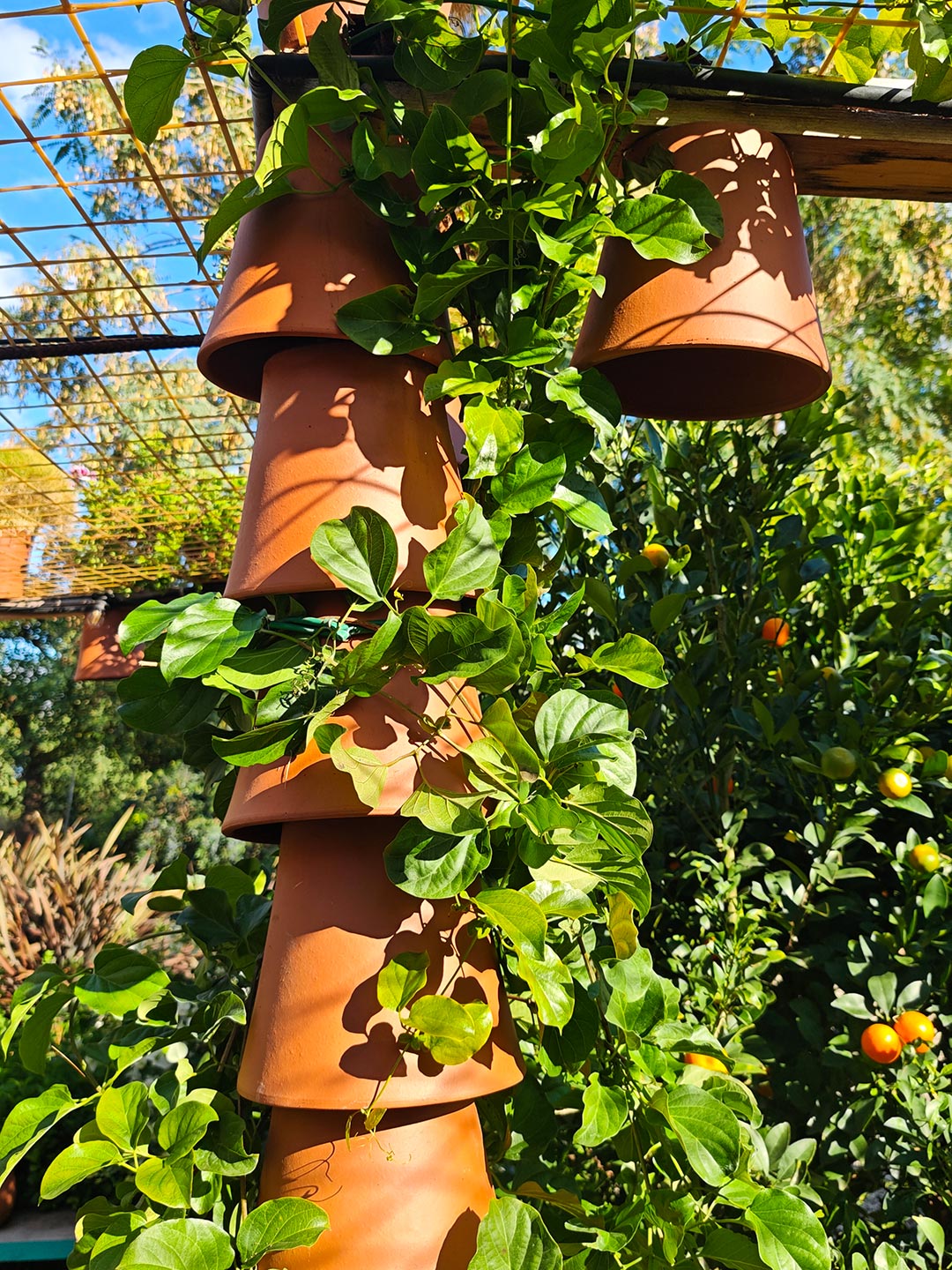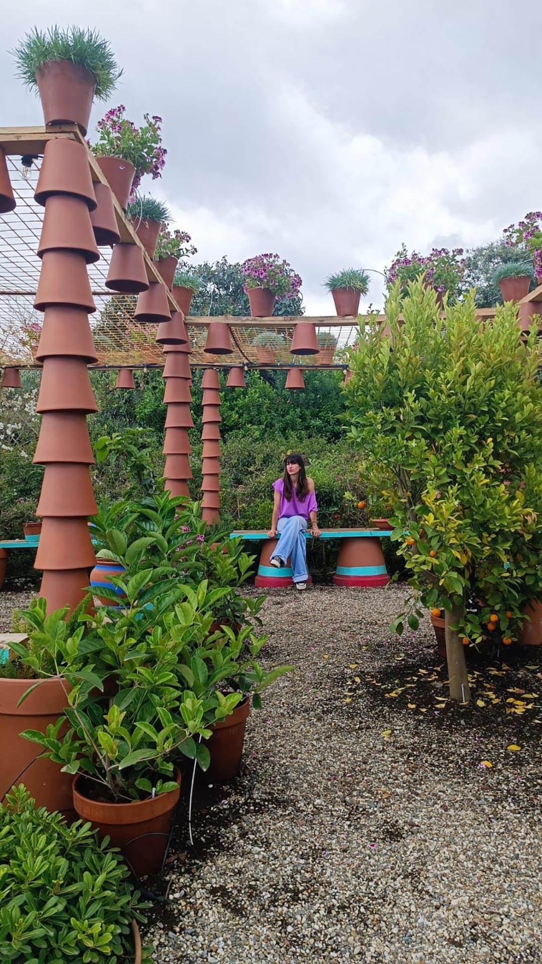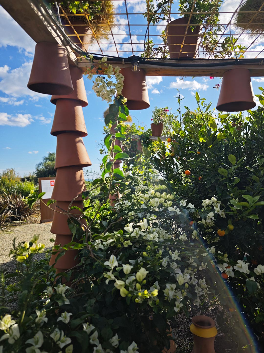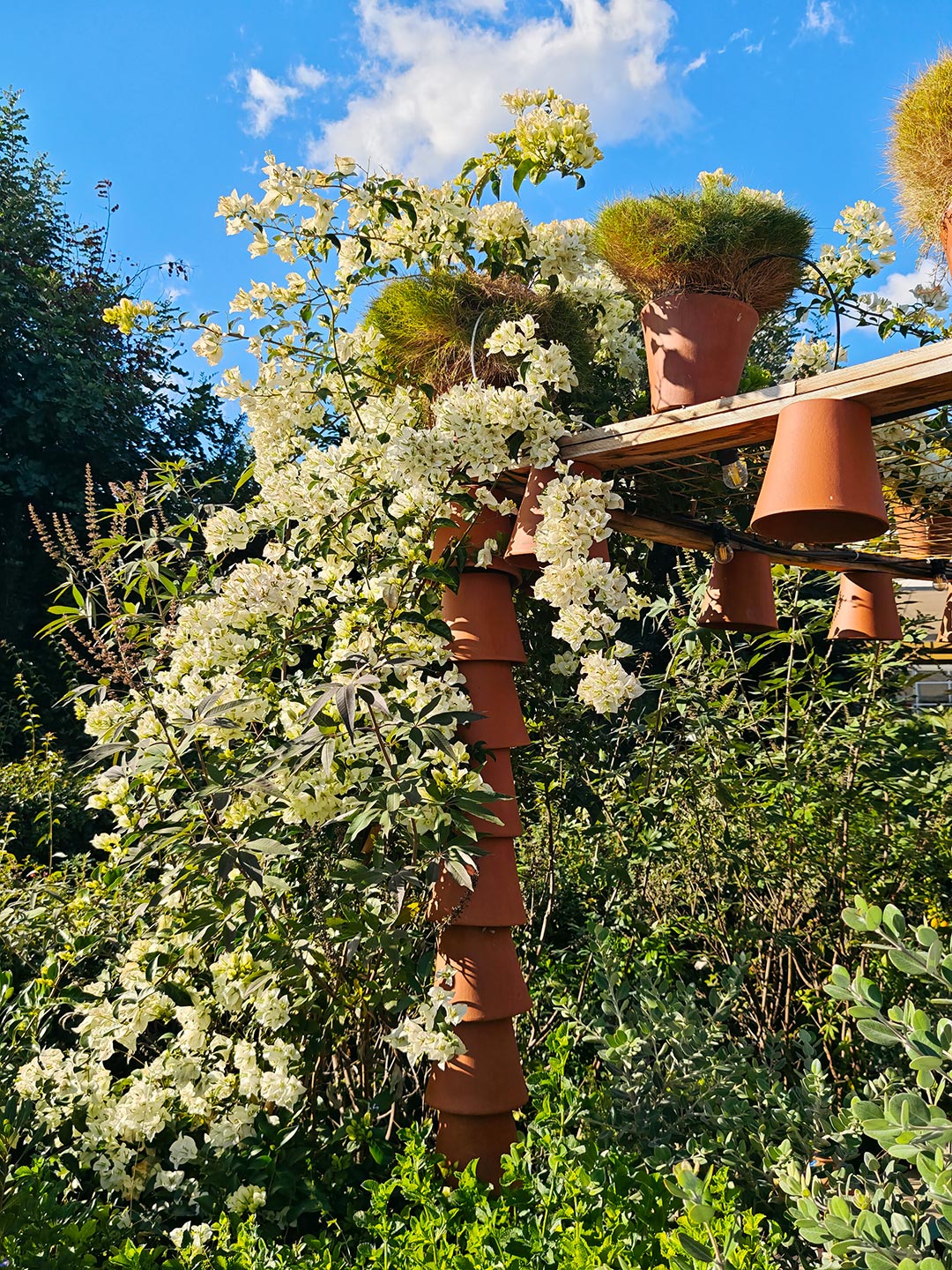 Inverted terracotta pots form boundaries, creating continuity from walls to ceiling. Dappled daylight, combined with the scent and colour of carefully curated foliage, creates a rich, synaesthetic experience.